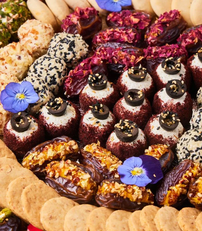 Dates With Rose Petal, And Saffron Cream With Pecan Nuts.